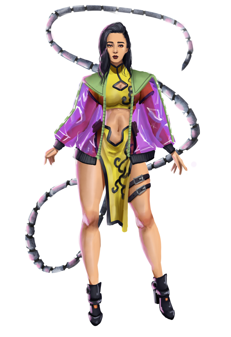 The beginning of Mao’s life was not a good one. She grow up in the Chinese sex trade, being addicted to heroin at an early age. The animatronic tail added to her spine was attached to her, because her owner at the time thought it would get her more Jons. The moment it was done healing, from the agonizing surgery Mao broke his neck, and escaped. She ended up hiding in the Forbidden city. To live she stole food, gaining the name shadow of the forbidden city. Alone the little cat detoxed herself. It was the hardest thing she had ever done, yet she wanted to be free from her past. When she met Mara, they were at odds, something Lightning Fast squashed quickly. Throughout the war she was a valuable teammate, being in the squad which took down the group's traitor. She did so not without taking having a rough go at it. Kicked through walls, and damn near choked to death, she fought on. When the end of the conflict came, she wanted nothing to do with holding power, gladly taking the position of mascot for The Star Empress. The has become the face of the Mara brand.